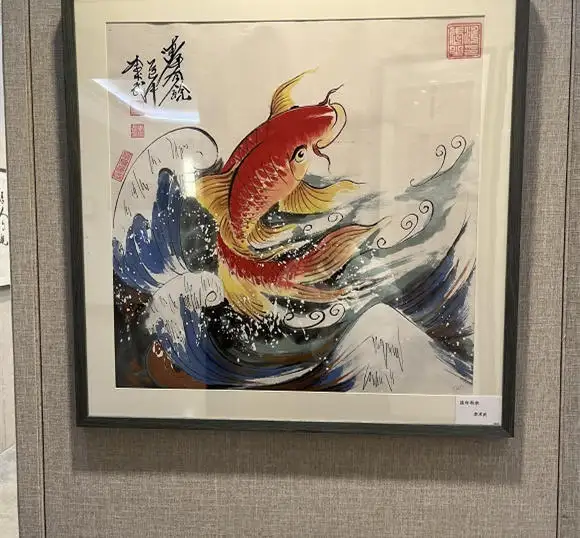 他的作品,绝非对传统图式的简单复刻,而是为古老吉祥寓意注入当代生活的呼吸。画中鲤鱼并非孤立静物,而是以灵动机敏的姿态跃动于福山寿海,一直有余,以墨色层层晕染出鳞片的湿漉光泽;莲叶则以泼彩手法挥洒,青绿交融间仿佛能听见水声潺潺。构图在饱满中见疏朗,色彩在浓烈处显清雅,既有乡土艺术的质朴生命力,又透出文人画讲求的笔墨意趣。