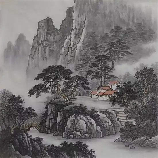 毛希文老师的山水创作,深植于传统笔墨的沃土。他精研宋元山水的皴法与构图,披麻皴的温润、斧劈皴的刚劲在其笔下运用自如,线条的提按转折间,既勾勒出山石的嶙峋肌理,又蕴含着书法的筋骨韵味。墨色的干湿浓淡层层晕染,近山的苍劲、远山的朦胧、云气的轻盈皆跃然纸上,营造出 “咫尺千里” 的深远意境。画面中的松枝以逆势出笔,劲挺如铁;流泉以留白衬墨,似闻潺潺之声;茅亭的点染则为雄浑山水添了几分人文意趣,尽显 “外师造化,中得心源” 的创作真谛。
