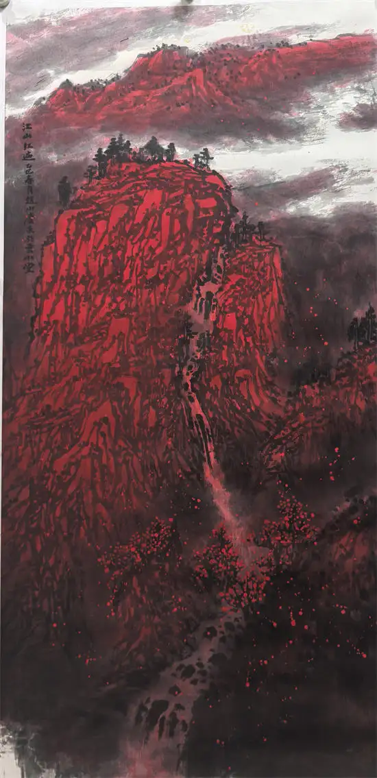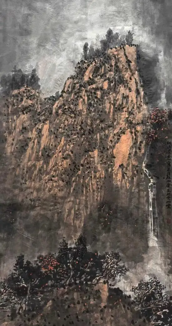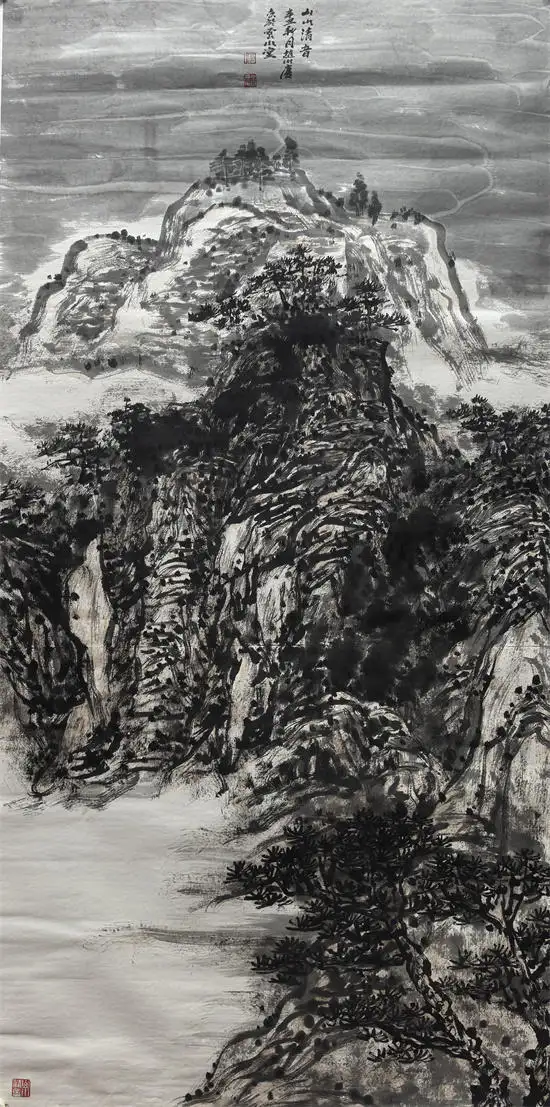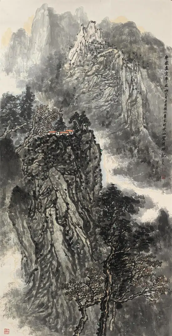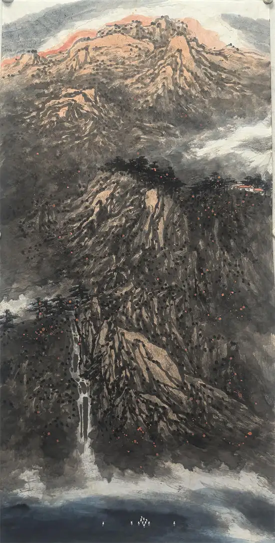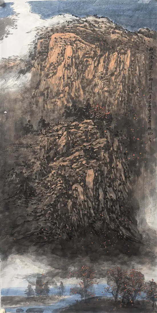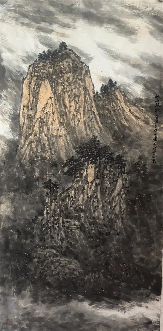 他的作品,多用积墨法,渲染出大壑大丘的雄浑苍润,突出大山的雄伟壮阔;运用皴擦点染的变化,寻找与自然节奏的契合点;运用灵动的笔法,酣畅的墨色,映衬以略施淡彩的桃花,相得益彰。他的山水苍古淳雅的唯美画面,透射出的是中国传统的“山水质有而趣灵”的山水精神。