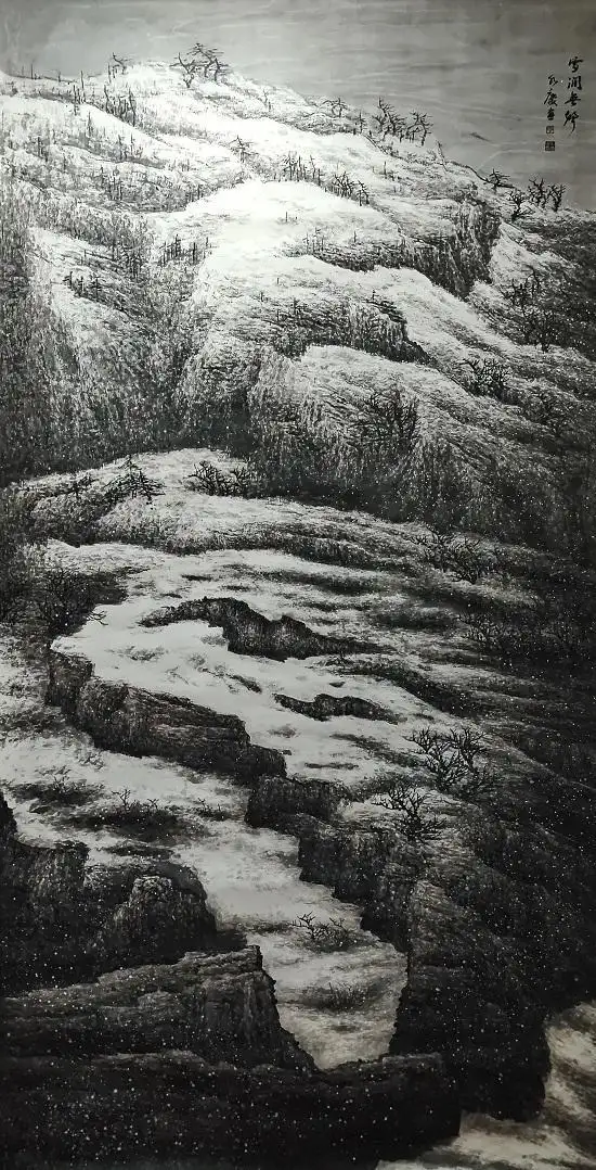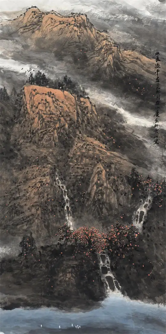 如何完善自我,如何提炼艺术语言,是每个画家一生都需要做的功夫。他一手抓住传统,一手伸向生活,使得临摹、写生、创作三位一体,互生互动。他紧紧抓住笔、墨两大元素,注重个性的培养和精神的升华。他心观自然、心观人生、心观笔墨,在“心观”上下功夫,笔触间蕴含着中国哲学思想。事实上,中国画的发展在某种程度上深受老庄哲学的影响,“圣人食道应物”,“对人以神清道”,即老庄之道。古人把画山水和观山水作为一种体道行为。水庆也遵循老庄学说“行非道生”“行于万物者,道也”,“循道而趋”。