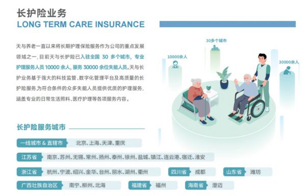 目前天与长护险已入驻全国 30 多个城市,专业护理服务人员 10000 余人,服务 30000 余位失能人员。天与长护业务基于强大的科技监管、数字化管理平台及高质量的长护险服务为符合条件的众多失能人员提供优质的护理服务涵盖专业的日常生活照料、医疗护理等各项服务内容。