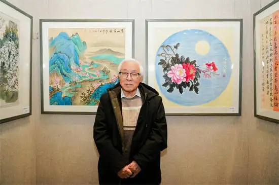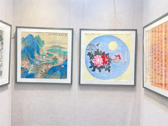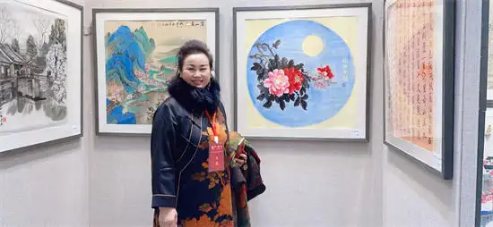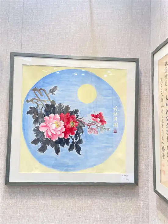 荣宝斋银龄书画展的展厅里,项红老师的《花好月圆》牡丹图格外动人。一方圆形画幅中,淡蓝月色铺陈底韵,粉红牡丹娇妍绽放,金黄圆月悬于花间,笔墨间揉着中式美学的温婉与圆满,也让荣宝斋的百年文脉里,多了一抹来自银龄创作者的温情笔触。