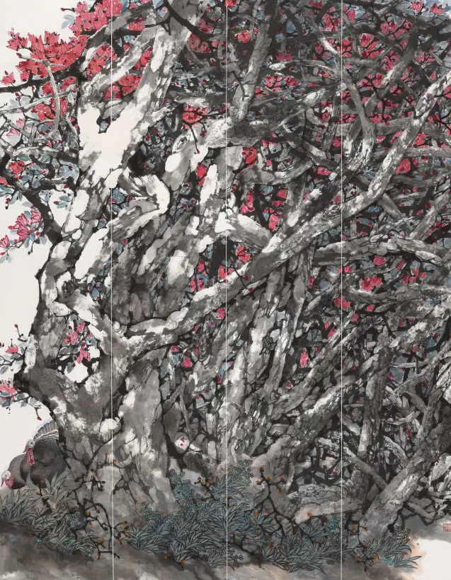 在数十年的艺术实践中,崇雨竹形成了雄浑大气又不失灵动雅致的艺术风格。她擅长大写意花鸟,笔下的花鸟并非简单的自然摹写,而是融入了自身的情感与思考,具有强烈的精神内涵。大写意花鸟讲究“以形写神”“意在笔先”,崇雨竹深谙此道。她的笔墨运用娴熟自如,线条刚劲有力,墨色浓淡相宜,干湿相生。在作品《争艳》中,便可见其大写意花鸟的深厚功力。画面中,花卉竞相绽放,枝蔓交错,鸟儿或栖息枝头,或展翅欲飞,充满了生机与活力。她以豪放的笔触勾勒出花卉的轮廓,用浓淡变化的墨色表现出花瓣的层次与质感,色彩的运用则恰到好处,既增添了画面的视觉冲击力,又不失传统中国画的雅致。这幅作品不仅入围十三届全国美展北京市中国画展,还入选中国美协举办的第二届“白山黑水·美丽四平”中国画作品展,足见业界对其艺术水准的认可。