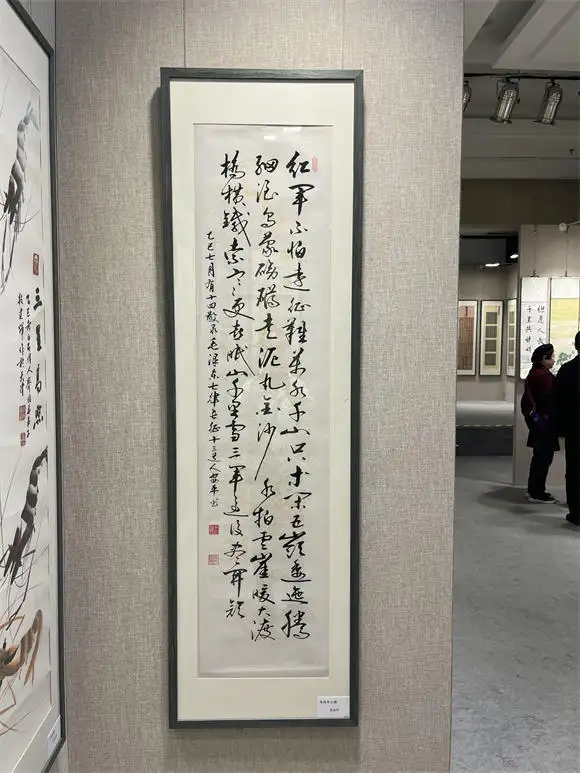 在荣宝斋汇聚古今精粹的展厅中,这件作品犹如一座笔墨铸就的纪念碑。它既是对主席诗篇气魄的深刻理解与呼应,亦是书法家个人情怀与时代精神的交融——以传统书法的笔墨语言,诠释现代中国的精神史诗,让红色经典在酣畅淋漓的线条中,获得全新的艺术生命。