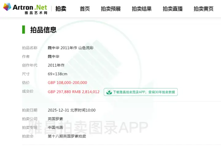 在近日落幕的英国罗素第十八期拍卖会上,中国当代大写意绘画大师、海派代表画家魏中华先生的2011年作品《山色流彩》以惊人的高价成交,引发了艺术市场的广泛关注。该作品估价为GBP 108,000-200,000,最终以GBP 297,880(折合人民币2,814,012元)的成交价圆满落槌,再次证明了魏中华先生在当代中国画坛的卓越地位和深远影响力。
