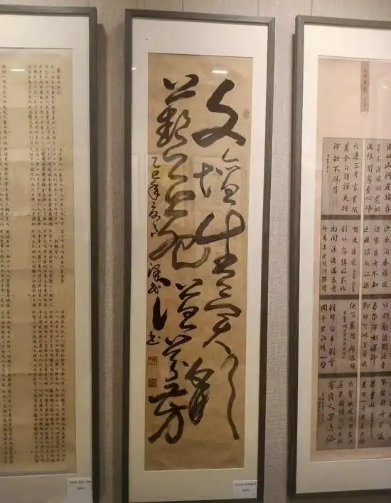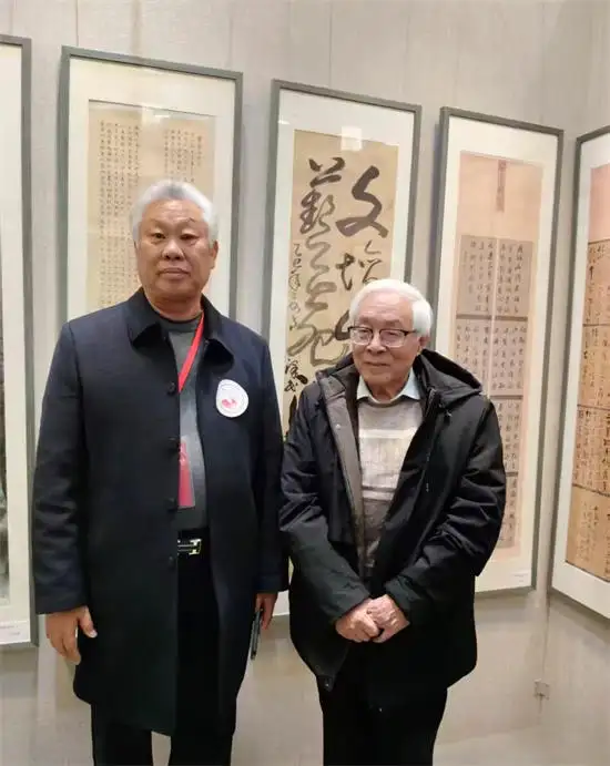 单国强老师在作品前停留欣赏,表示对贺泽民老师的书法很认可,并合影留念。