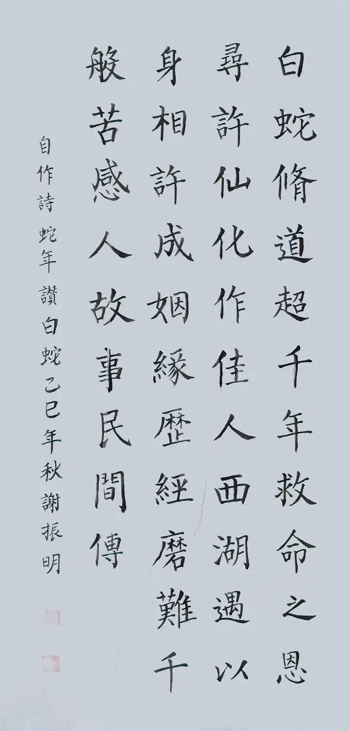 谢振明秉承“功夫在字外”之理念,自省自励自强,厚德载物。自创九百多字的现代诗《我爱美丽的攀枝花市》及每句七字,近三百字的诗《感恩领袖邓小平》,收录于《书香雅颂·获奖诗歌选集》。2021年,被中国传统诗词学会及文化艺术人才库授予“优秀诗词家”称号,并永久入编文化艺术人才库。