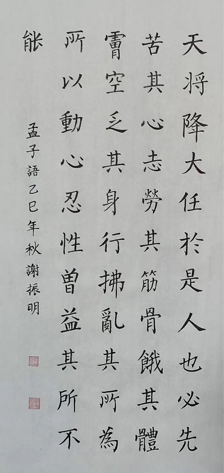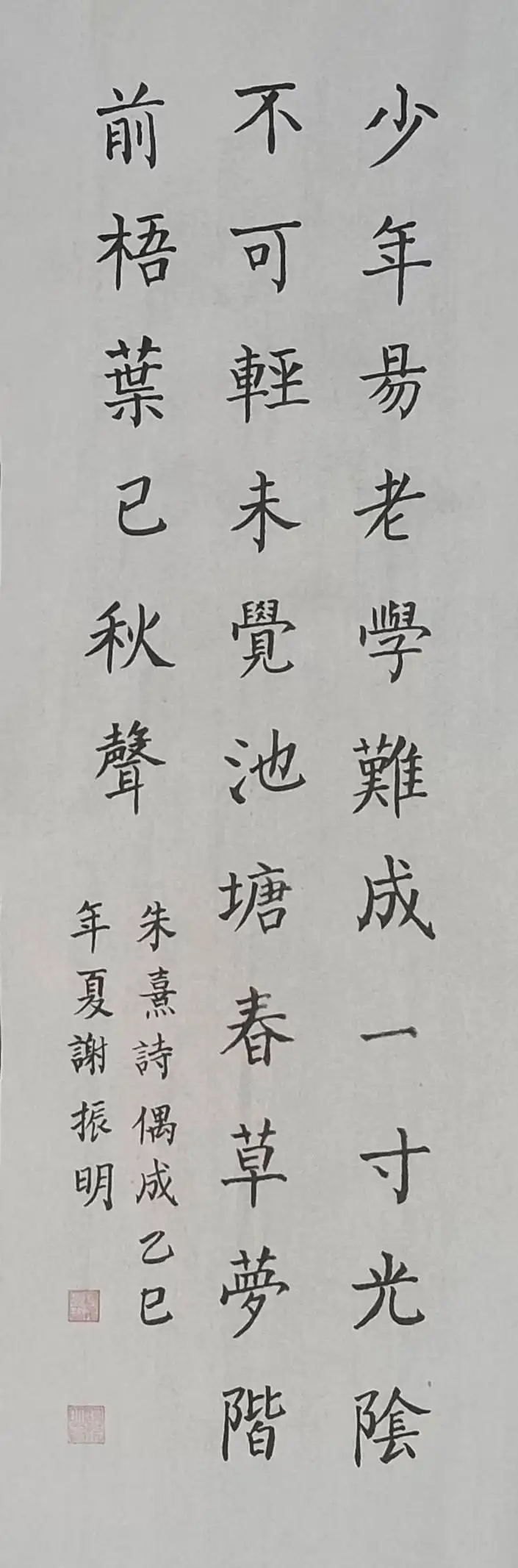 自幼浸润于笔墨书香,谢振明的艺术之路,从年少时的潜心研习便已埋下伏笔。他自小便钟情书法与文学,将这份热爱融入日常,以恒心磨笔墨,以静心品文韵,在一撇一捺的练习中夯实书法根基,在一字一句的研读中涵养文学底蕴。书法之道,从来不是简单的笔墨挥洒,而是文化修养与人生阅历的综合沉淀,年少时的日积月累,让他早早便懂得笔墨背后的文化重量,也让他在往后的艺术之路上,始终保有对传统艺术的敬畏之心。这份自幼养成的研习习惯,成为他艺术生涯的坚实根基,无论是书法创作中的笔法精进,还是文学创作中的文思泉涌,都离不开年少时的潜心积淀,也让他在艺术探索的道路上,起步便有着远超常人的文化底气。
