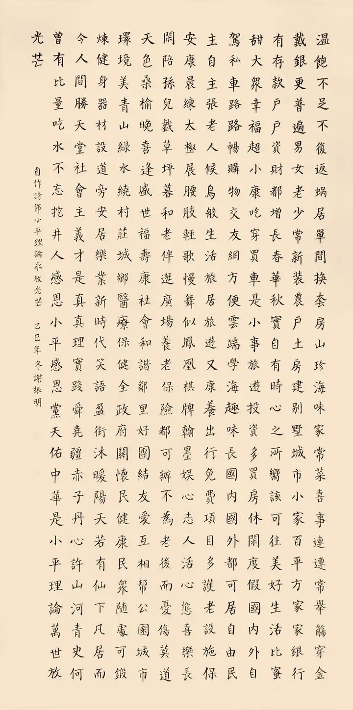 难能可贵的是,谢振明始终秉承“功夫在字外”的艺术理念,深知艺术创作从来不是闭门造车,唯有跳出笔墨本身,涵养心性、提升修养,方能让作品更有厚度、更有灵魂。他在深耕书法的同时,从未放松对自身品德的锤炼,以自省自励自强为准则,以厚德载物为追求,将做人与从艺紧密结合,让高尚的品德修养融入笔墨创作之中,让其作品不仅有笔墨之美,更有人格之韵。这份“字外功夫”的修炼,更体现在他对文学领域的深耕,他在书法创作之余,醉心诗词创作,以文载情,以诗言志,自创九百多字的现代诗《我爱美丽的攀枝花市》,字里行间满是对故土与生活的热爱;近三百字的七言诗《感恩领袖邓小平》,句句饱含深情,字字传递敬意,两篇佳作皆收录于《书香雅颂·获奖诗歌选集》,成为文学领域的亮眼之作。深厚的文学素养反哺书法创作,让他的笔墨作品更有文气、更富内涵,也让他在艺术之路上实现了书法与文学的双向成就。2021年,他被中国传统诗词学会及文化艺术人才库授予“优秀诗词家”称号,并永久入编文化艺术人才库,这份荣誉既是对其文学成就的肯定,也印证了他“诗书画兼修”的深厚功底,让他成为当代艺坛中少见的兼具书法造诣与文学才情的全能型艺术家。