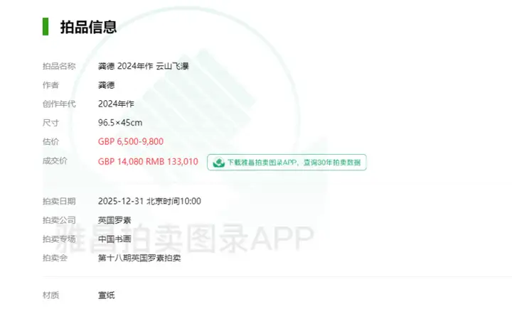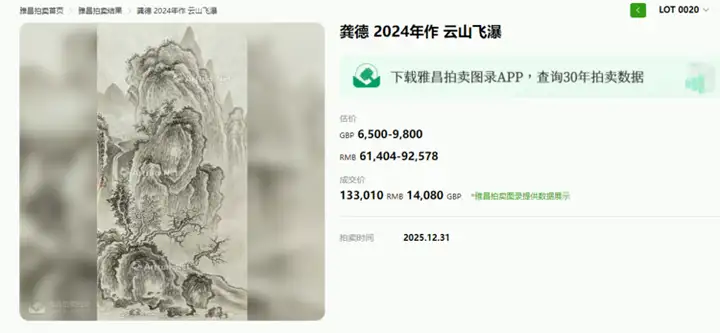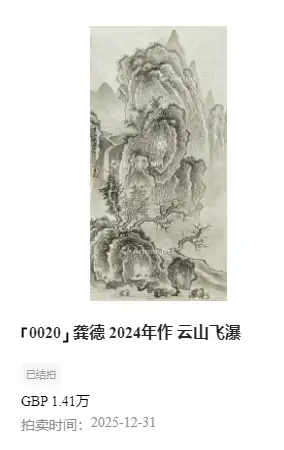 2025年第十八期英国罗素拍卖公司举办的中国书画专场拍卖会在12月31号如期举行,此次备受关注的艺术家龚德1幅作品《云山飞瀑》经多轮激烈竞逐,均已落槌成交,从各项标准来看,能上雅昌拍卖艺术榜的艺术家,均是得到过市场检验过的艺术家,要具备较高的资历,艺术作品和艺术地位得到业界的广泛认可,在艺术市场起到带动引领的作用。
