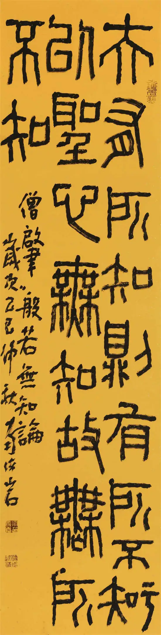 感悟中国笔墨的意义,要识得书画同源,识得书画同源,就要从书法中感悟绘画中笔的意义,所以南先生认为,画好中国画必须练好书法。海岩先生的绘画作品早年间题款很少,多以穷款形式出现。当时是取向题的完美,如今作品多以长跋为主,是为了增加绘画的内涵和意义,使画面的艺术灵魂进入画境,下面我们把南先生的书与画分开,单独审议海岩先生书法,其魅力与画同义。海岩先生的书法有其特有的特点"金石味、形式美、穿透力"金石味是形容书法的美像篆刻家刻石出现的美一样,具有鬼斧神工之意,且一掷地有声。