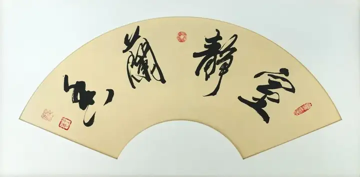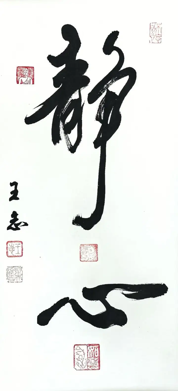 观王志老师的书法作品,每一幅都堪称艺术珍品。看那幅“福”字,笔力雄健,墨韵饱满,金色的字体在红色宣纸的映衬下熠熠生辉,仿佛蕴含着无尽的福气与祥瑞;扇面书法“室静兰香”,字体飘逸洒脱,布局疏密得当,扇面虽小却尽显雅致与宁静;而“龙马精神”四字,则如蛟龙出海,气势磅礴,让人感受到一种勇往直前的精神力量。“静心”二字,用笔简洁却意境深远,仿佛能让人在喧嚣的尘世中寻得一片宁静的港湾。还有那心经书法作品,字迹工整秀丽,笔画细腻流畅,将佛教经典的神韵展现得淋漓尽致,让人在欣赏书法之美的同时,也能感受到心灵的洗礼。