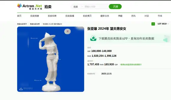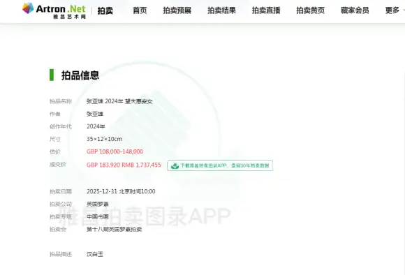 2025年第十八期英国罗素拍卖公司举办的中国书画专场拍卖会在12月31号如期举行,此次备受关注的雕刻艺术家张亚雄作品《望夫惠安女》经多轮激烈竞逐,最终以183,920英镑,折合人民币1,737,455元落槌成交,远超此前108,00-148,000英镑的估价区间,从各项标准来看,能上雅昌拍卖艺术榜的艺术家,均是得到过市场检验过的艺术家,要具备较高的资历,艺术作品和艺术地位得到业界的广泛认可,在艺术市场起到带动引领的作用。