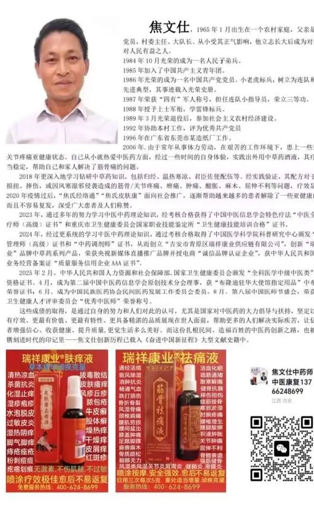 2006年.由于常年从事体力劳动,在艰苦的工作环境下,患上一些筋骨.关节疼痛亚健康状态。自己从小就热爱中医药方面,经过一些时间的自身体验,实践出外用中草药酒液,其疗效相当稳定,帮助自己和家人解决了筋骨痛的问题。